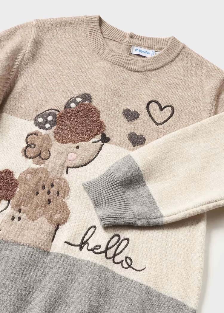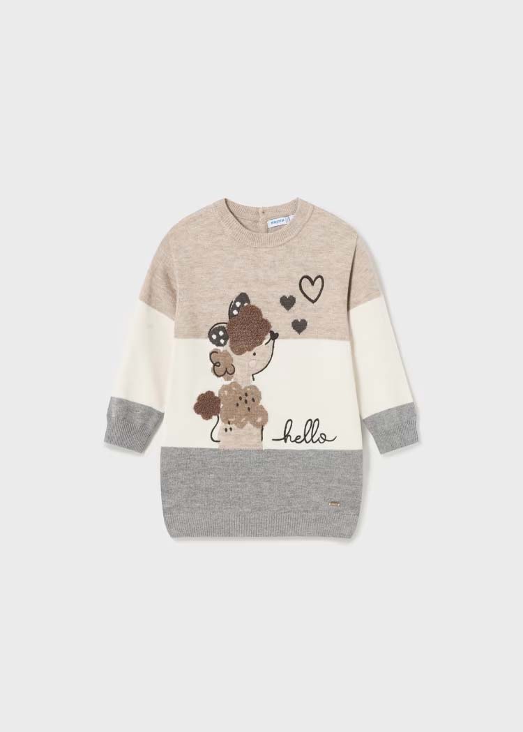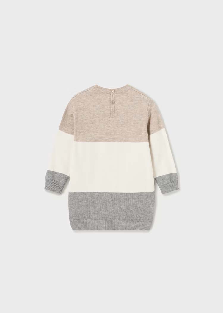 Vestido de manga larga para bebé. Cierre con botones en la espalda para facilitar la puesta de la prenda. Tejido de punto grueso cálido y suave. Dibujo tejido con técnica intarsia.